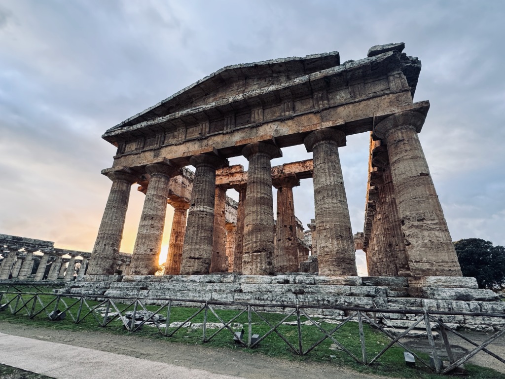 Paestum to kawałek starożytnej Grecji w Italii, do którego, zdaniem Zbigniewa Herberta, “warto pielgrzymować nawet piechotą” (Barbarzyńca w ogrodzie, esej “U Dorów”). Miasto powstało w VII w. p.n.e. jako kolonia grecka pod nazwą Posejdonia. Założyli je Sybaryci, czyli mieszkańcy achajskiego miasta Sybaris, położonego nieco dalej na południe (czyli de facto Posejdonia była kolonią kolonii) - ale miasto było zamożne i wygodne (termin “sybaryci” nie wziął się znikąd). Do naszych czasów dotrwały w Paestum resztki zabudowy (greckiej oraz późniejszej, jako że miasto było zamieszkane aż do wczesnego średniowiecza, kiedy ludność zdziesiątkowała zaraza), a także - co jest powodem wycieczki - trzy bardzo dobrze zachowane świątynie w stylu doryckim. Powstały w szczytowym okresie rozwoju miasta, pomiędzy 550 a 440 rokiem p.n.e. Hera była najważniejszym bóstwem Posejdonii i to jej poświęcono najstarszą świątynię. Zachował się cały pierścień zewnętrznych kolumn (w układzie 9 na 18) wraz z belkowaniem. Nieparzysta liczba kolumn od frontu jest nietypowa dla architektury greckiej; pierwsi archeolodzy (XVIII wiek) przypuszczali wręcz, że była to rzymska bazylika. Kolumny są stosunkowo niewysokie i dość przysadziste, a “rozpłaszczone” kapitele stwarzają wrażenie, jakby całość uginała się pod ciężarem (niezachowanego) sklepienia. Oddajmy znów głos Zbigniewowi Herbertowi: [Styl dorycki] “Jest surowy jak dzieje jego twórców przybyłych z północy. Krępy, przysadzisty i, chciałoby się powiedzieć, atletyczny, godny epoki herosów, uganiający z maczugą za dzikiem. Zwłaszcza rysunek kolumny ma wyraźną muskulaturę. Pod ciężarem architrawu rozłożysty kapitel nabrzmiały jest od wysiłku.”